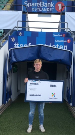 Oliver Valaker Edvardsen ble utropt til banens beste spiller etter innsatsen mot Haugesund lørdag kveld. Sjekken fra Norsk Tipping som følger med utmerkelsen, gir han med glede videre til Drøbak-Frogn.