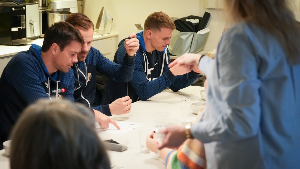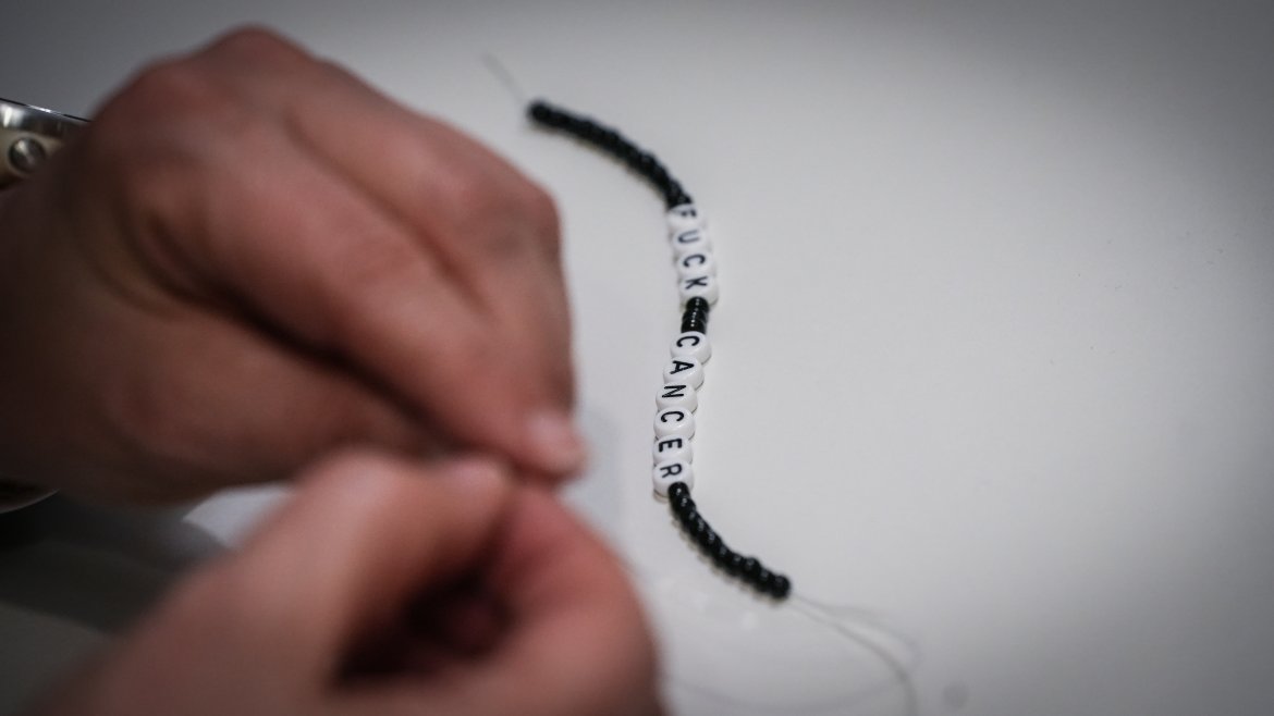 Bordet var dekket da vi kom – i første omgang ikke med mat, men med perler og spillerne satt i gang med å lage Fuck Cancer–armbånd i ulike størrelser. Selvsagt ble det litt konkurranse om hvem som perlet flest og fortest!